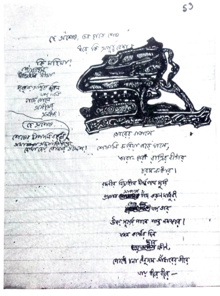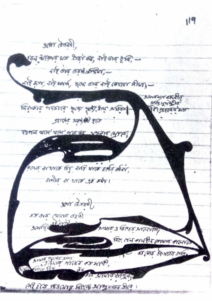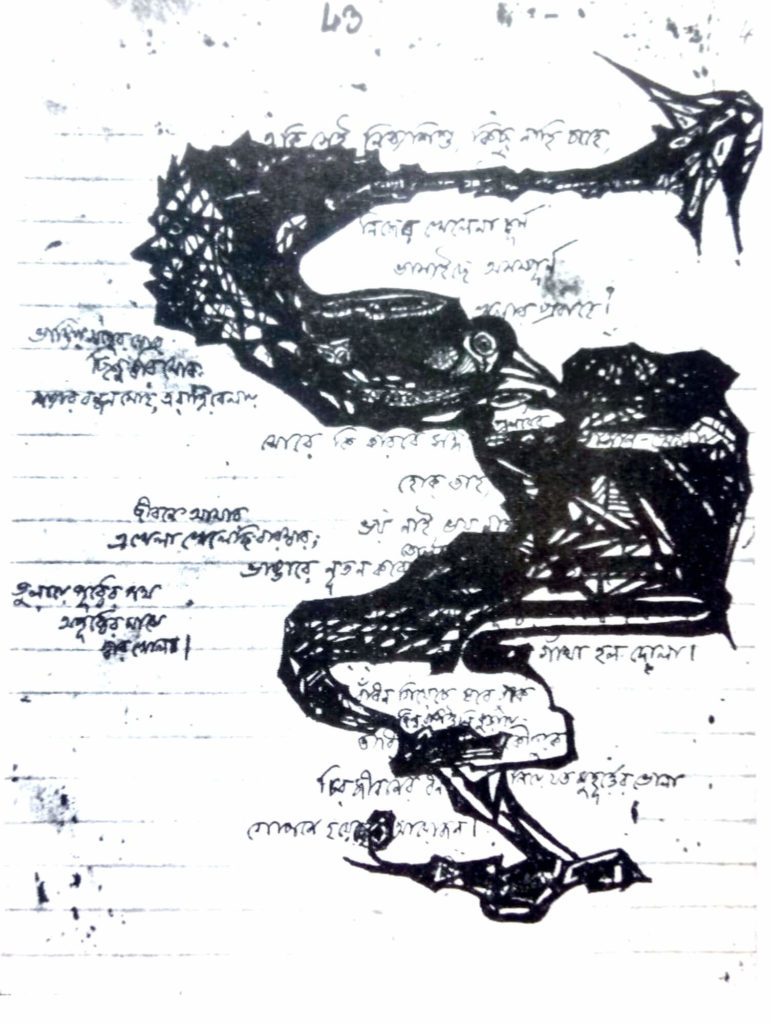 These scribbles are called doodles or erasures, yet these cannot be mere embellishments or illustrations as the name suggests but form an integral part of the poet’s creative process. Although not directly connected to his poetry, these doodles are important because these are his first artistic attempts, which later culminate in the impressive corpus of his 2000 odd paintings. No Indian artist, poet, or writer (except Rabindranath’s nephews Abanindranath and Gaganendranath Tagore) has done anything of this kind.