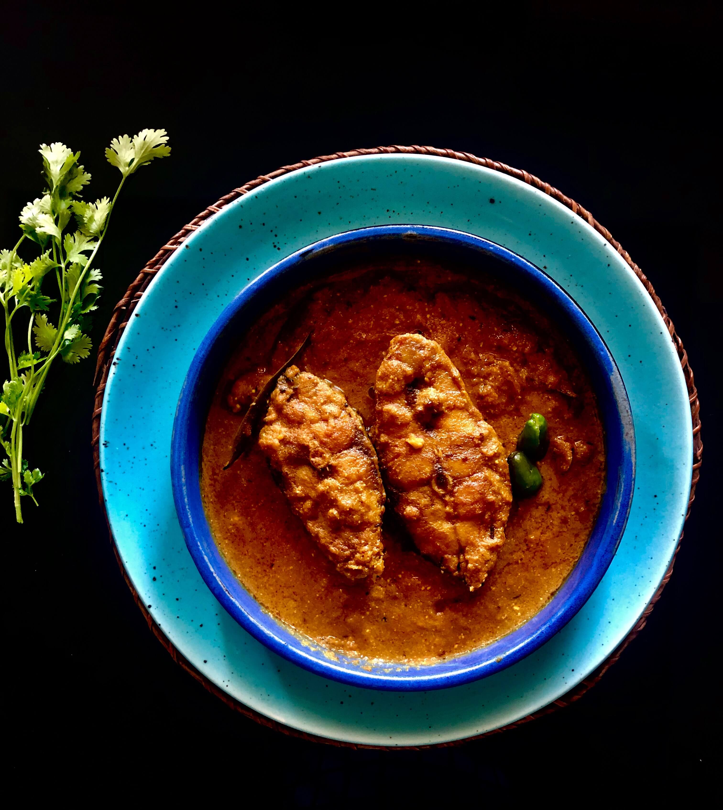 Mach, the fish paired with yogurt. Perfumed with cinnamon, cloves, and green cardamom. A handful of raisins, few mean chillies and earthy ginger.