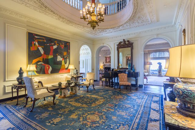 The large music room is the most dramatic of all with its circular opening in the ceiling, called an oculus, high arched doorways, and an embellished ceiling. A Steinway grand piano is tucked against a wall and a huge, colorful painting by Miro dominates the room. The feeling of opulence and elegance is amplified by the ornate elephants holding up a table and Chinese porcelain antiques, all grounded by a muted, blue floral carpet.
