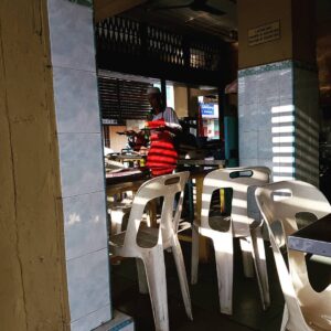 “We don’t have it here,” a waiter nodded in negation, “there is one upstairs, shared.”