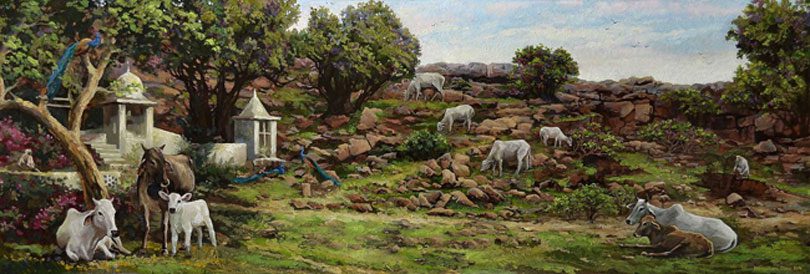 Sukha smiled, as if he was experiencing the beauty himself, “It sure does. And Krishna added to the charm of it. He took his flute and breathed music into it. The entire grove and beyond were intoxicated with this music. The peacocks began dancing, the trees swung happily and the cows left their fodder looking in the direction from where the music was flowing. All the animals were so mesmerized by the music that they stood still like a painted picture.